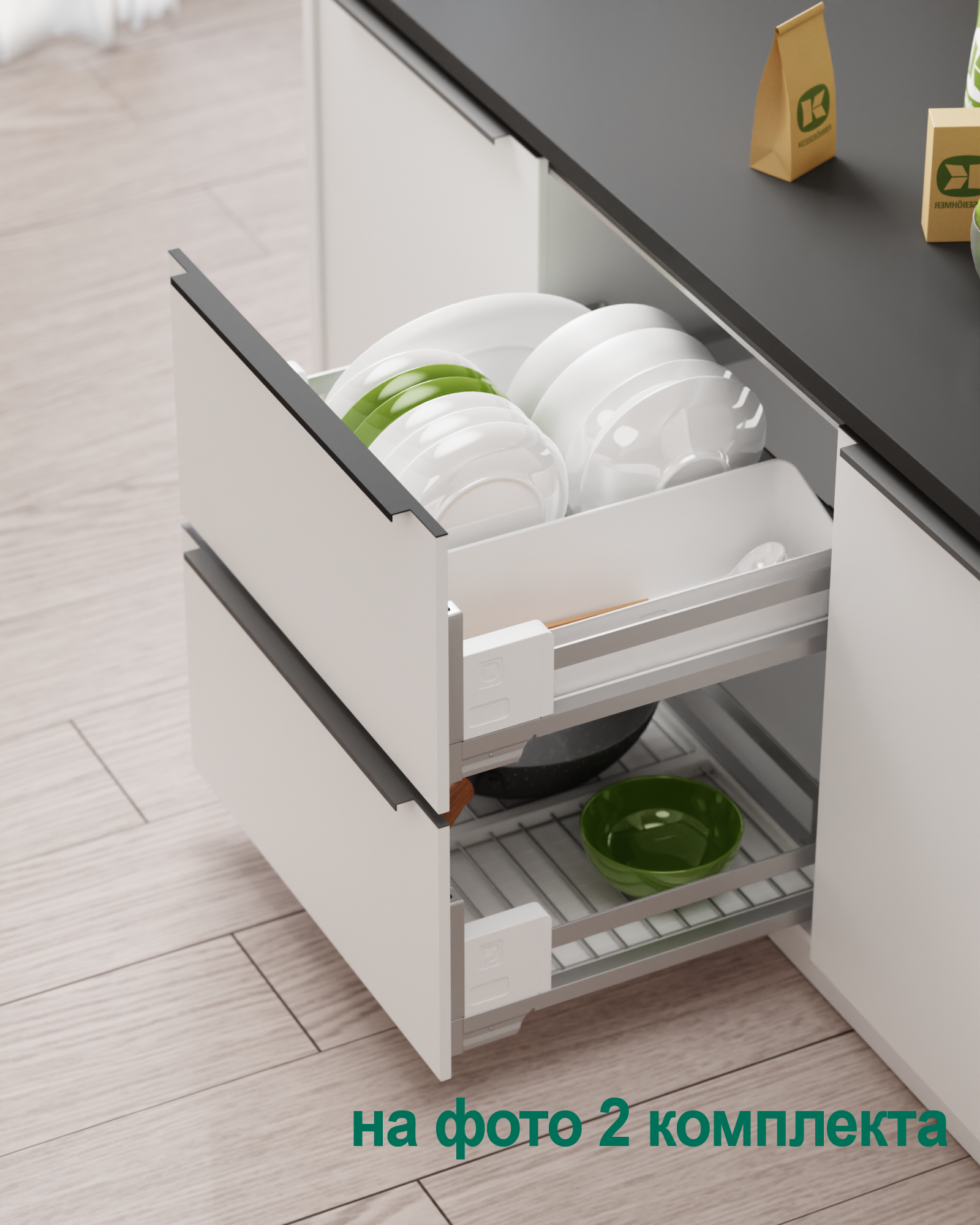 Ответ: Используйте модульную систему diningAGENT от Kesseböhmer — с полным выдвижением, возможностью мытья поддонов в посудомойке, защитой от царапин и функцией сервировочного подноса. Подходит для тарелок, блюд, чашек и столовых приборов. Доступна в цветах титан и антрацит, с доводчиком и нагрузкой до 12 кг.