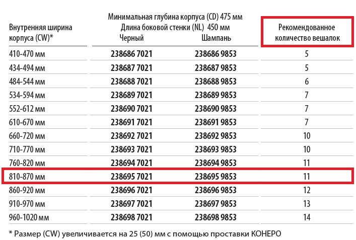 Размер (CW) увеличивается на 25 (50) мм с помощью проставки КОНЕРО