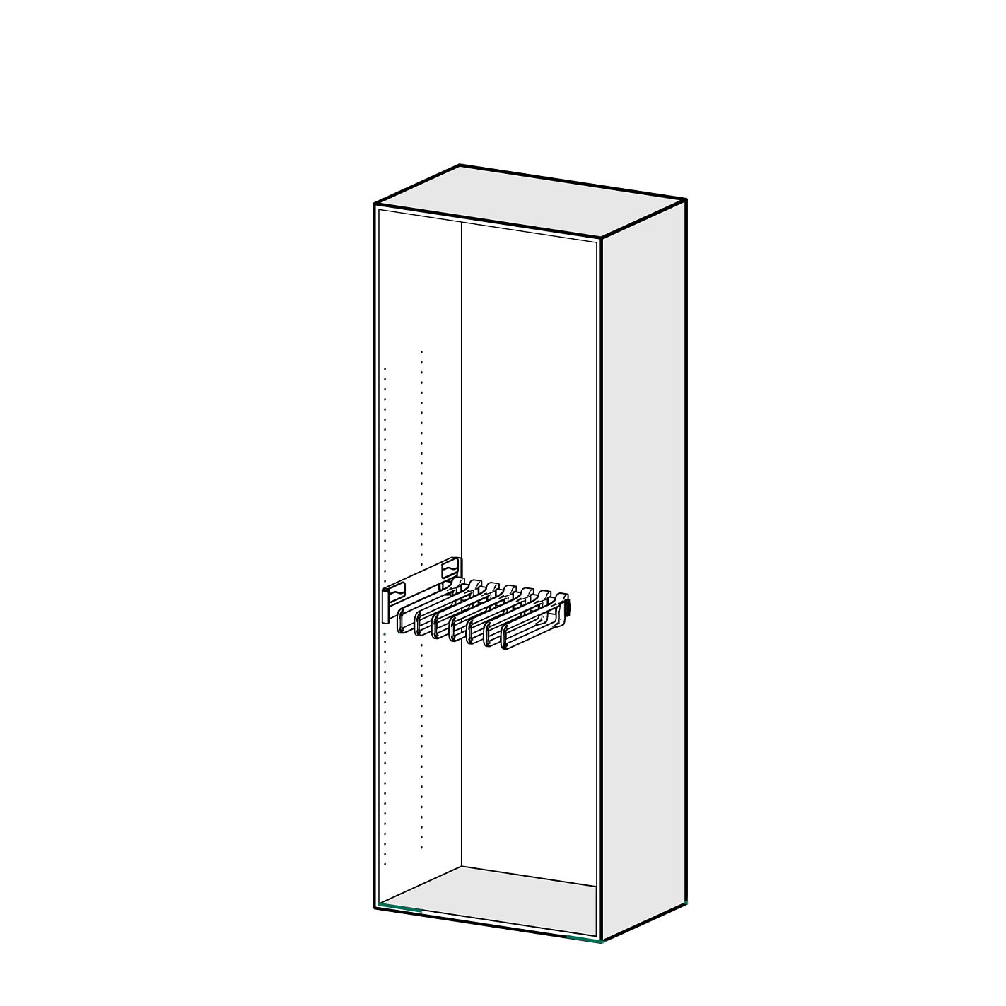 Держатель оснащен полностью скрытой направляю­щей выдвижения, тем самым обеспечивая бережное хранение одежды.