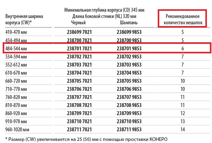 Размер (CW) увеличивается на 25 (50) мм с помощью проставки КОНЕРО