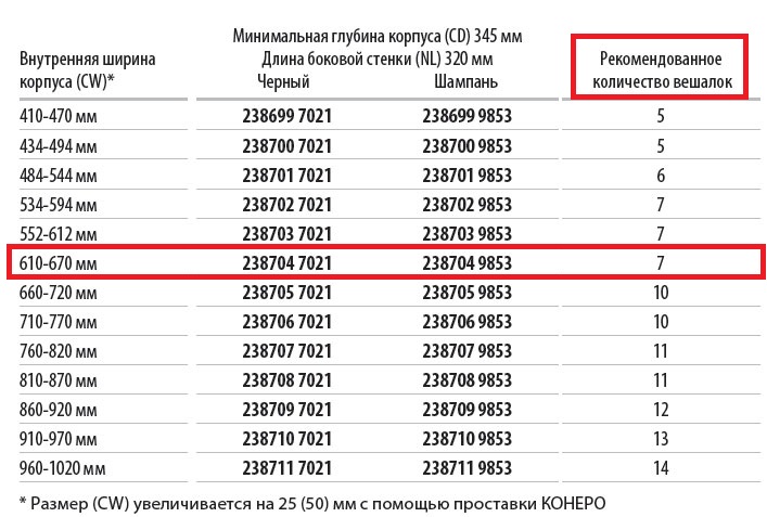 Размер (CW) увеличивается на 25 (50) мм с помощью проставки КОНЕРО
