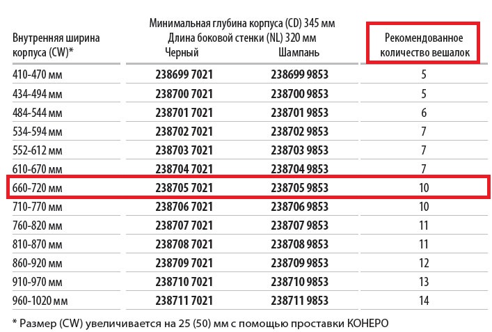 Размер (CW) увеличивается на 25 (50) мм с помощью проставки КОНЕРО