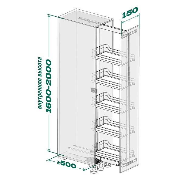 • Высокая нагрузка на механизм в 100 кг (по 18 кг на полку) позволяет организовать хранение большому количеству предметов, при этом даже при полной загрузке система выдвигается легко.