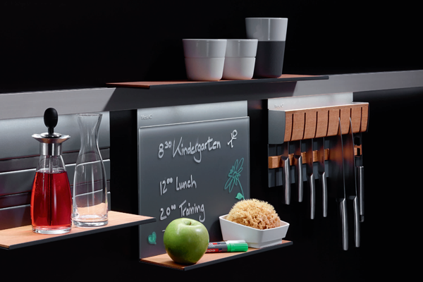 Линеро Мозаик Кессебёмер обеспечивает дополнительное место для хранения на кухне в зоне фартука. Основой системы служит алюминиевый профиль, подходящий для установки на все виды стеновых панелей. На него сверху и снизу навешиваются разные виды полок и держателей, которые можно легко снять и поменять местами. Помимо этого, система снабжена пазами для светодиодной подсветки. Вместе все эти элементы придают максимальный комфорт при использовании и создают уникальный внешний вид вашей кухни.